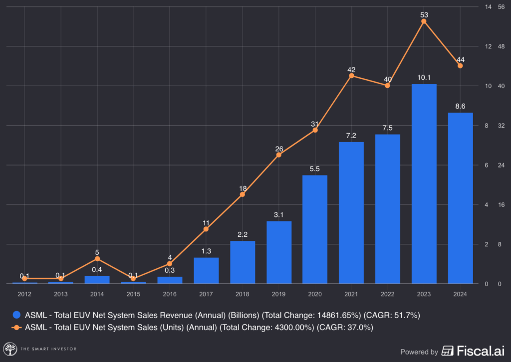 美国和中国都在努力推动人工智能领域的领先地位,但真正的竞争不仅仅是软件。真正的瓶颈是制造芯片的硬件。ASML是一家来自荷兰的公司,是唯一一家能够制造最先进半导体所需的极紫外机器的公司。中国一直在试图建造类似的东西,但这个过程非常艰难。它依赖于多年的专业知识和全球供应商网络,这就是为什么有些人认为中国仍然落后十年或更长时间。即使中国成功推出了一个可用版本,这只是第一步。将其扩大到稳定的产量则是另一回事。ASML本身每年只能生产有限数量的此类机器,而且已经领先了几十年。下图提供了2012年至2024年间其UVA收入和售出的系统数量的更多背景信息。