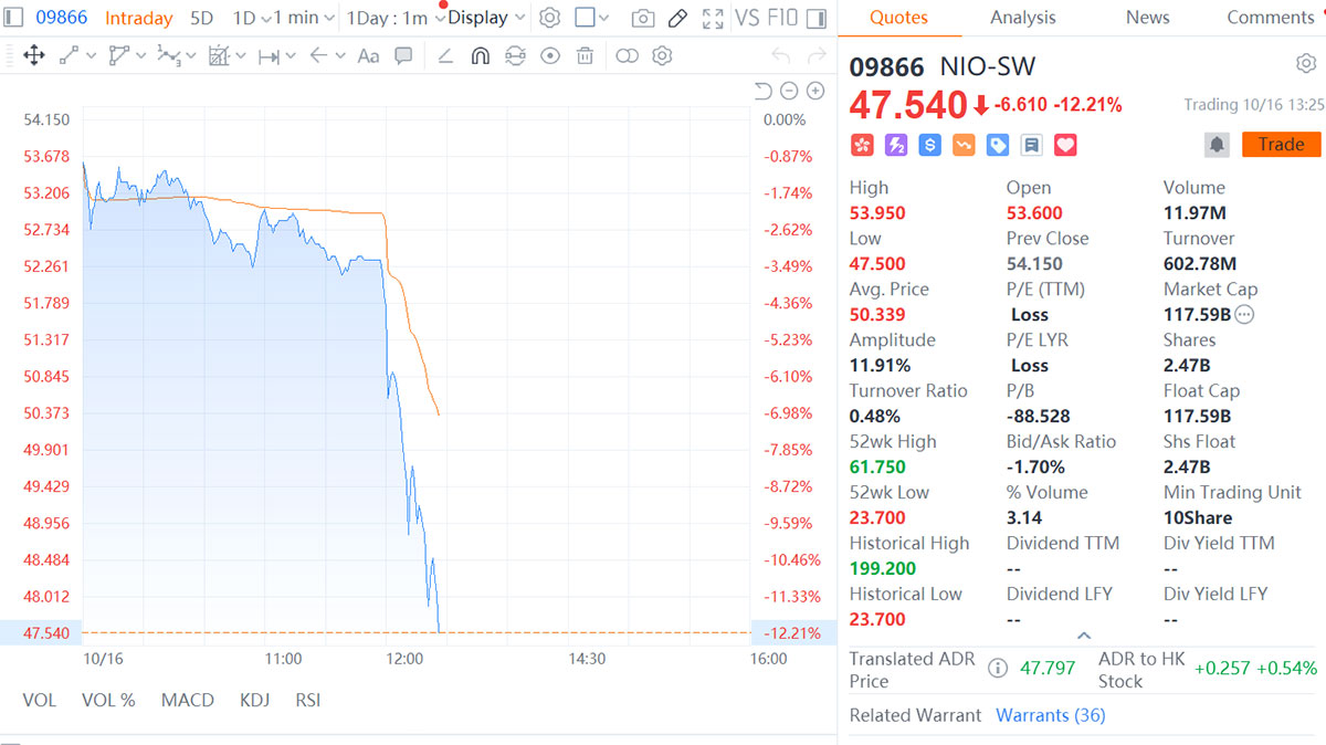 - As of press time, Nio had fallen 12.21 percent to HK$47.54 per share, poised for its biggest single-day drop since April 7.