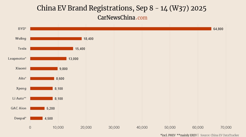 第 37 週の中国 EV 登録 : Onvo 2,620 、 Xiaomi 9,800 、 Tesla 15,400 、 BYD 64,800
